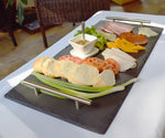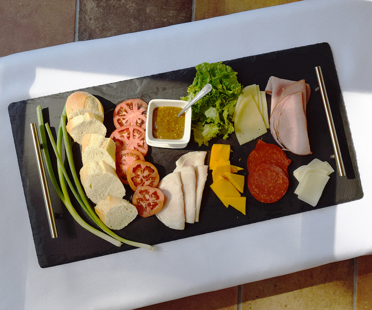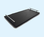 Exquisite and impressive. We offer our three largest Slateplates with stainless steel handles for easier hors d'oeuvre passing or serving. Beautiful and yet like all Slateplates, this is dishwasher safe. Choose from 12" x 18", 10" x 20" and 12" x 24" handled trays.