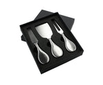 Custom designed, all stainless steel charcuterie set has three specially designed tools to compliment your cheese displays: two press knives to easily chop through hard cheeses and a fork for cutting and serving. Balanced and light weight. Each tool Measures 5.5". Dishwasher safe. Comes with an attractive black box for storage or gifting.